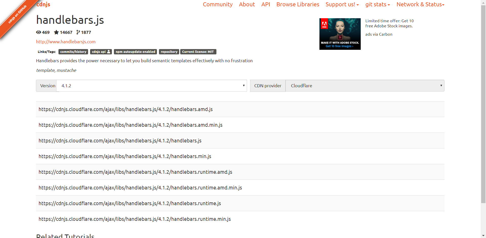 3) 4번째 줄 (https://cdnjs.cloudflare.com/ajax/libs/handlebars.js/4.1.2/handlebars.min.js)에 마우스를 가져간다.