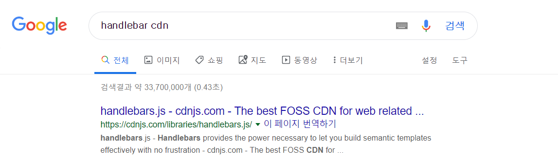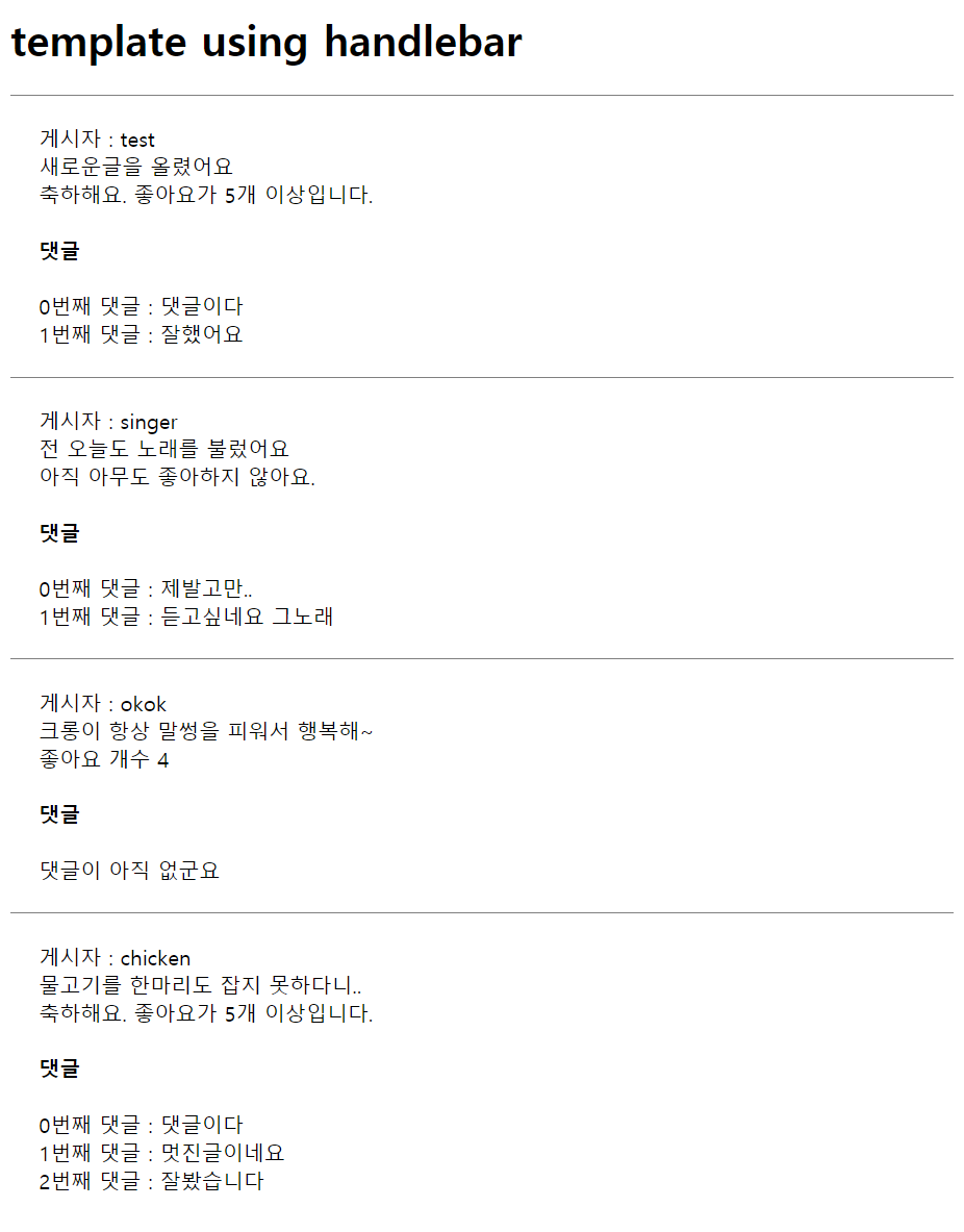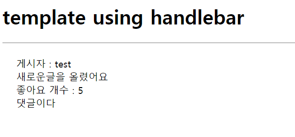 여기서 주의할 점은 handlebars로 템플릿 코드를 컴파일하는 코드보다 위에 있어야 한다는 것이다.