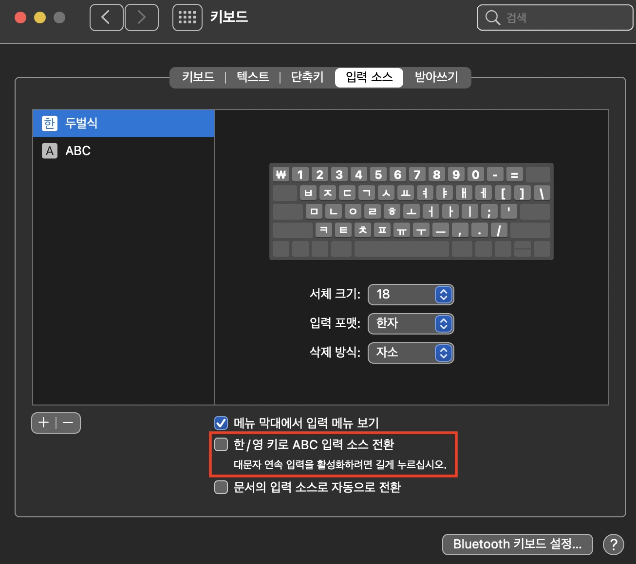 단축키 설정 옆에 입력 소스 탭으로 들어가 한/영 키로 ABC 입력 소스 전환 체크를 해제한다.